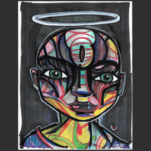 Le visage, traversé de couleurs très vives et de lignes noires massives, devient le lieu d’une bataille entre ordre symbolique et débordement perceptif