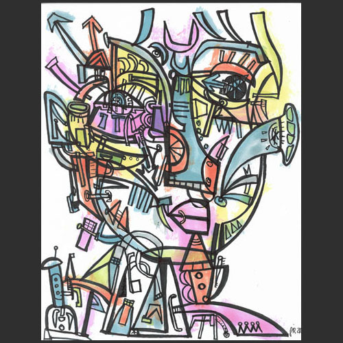 Dessin fusionne ici portrait et structure, comme si une tête était devenue territoire de machines