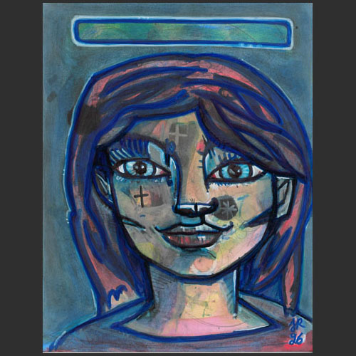 Le visage, frontal et fortement construit, reste pourtant doux grâce aux aplats colorés et aux petits signes disséminés